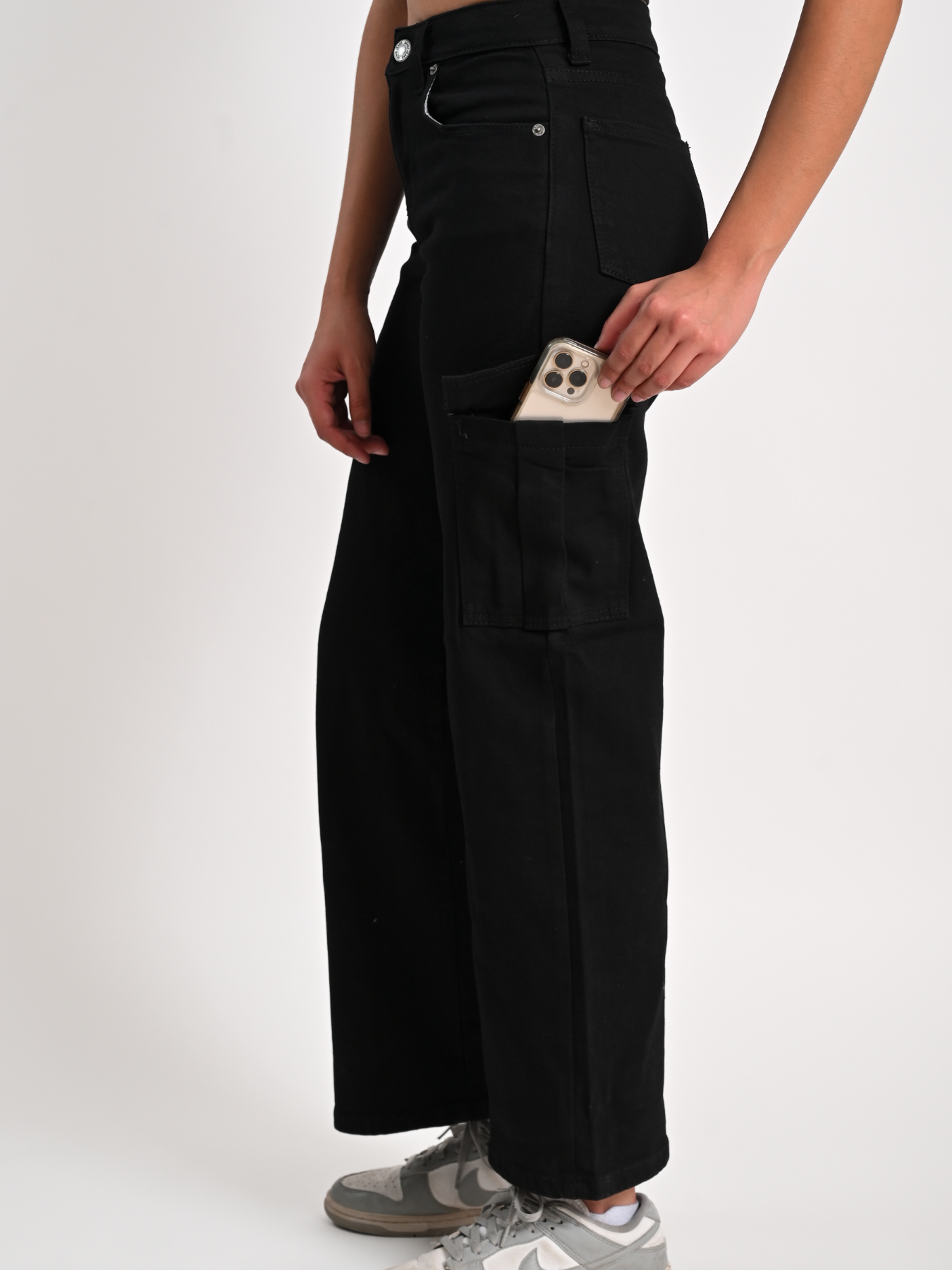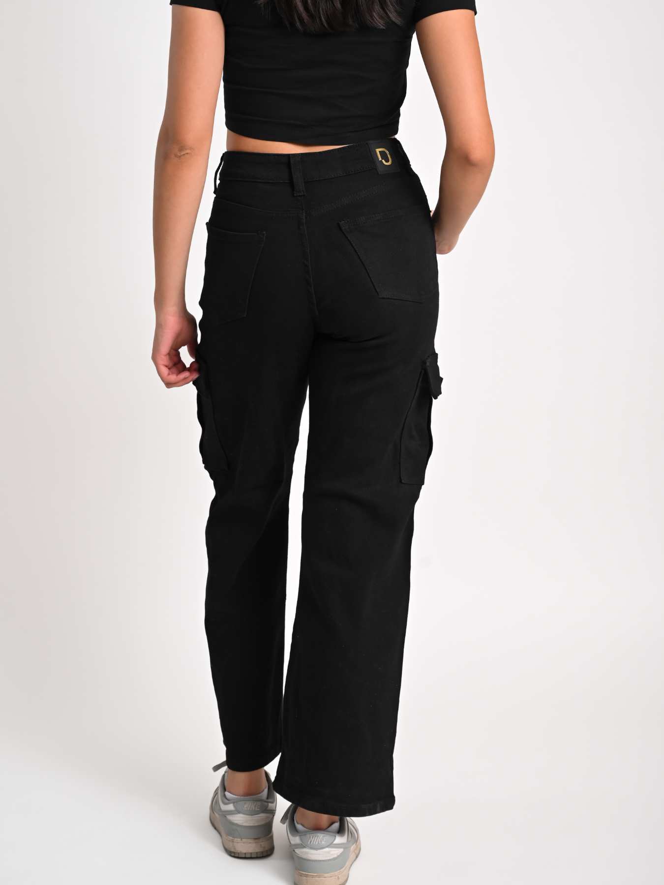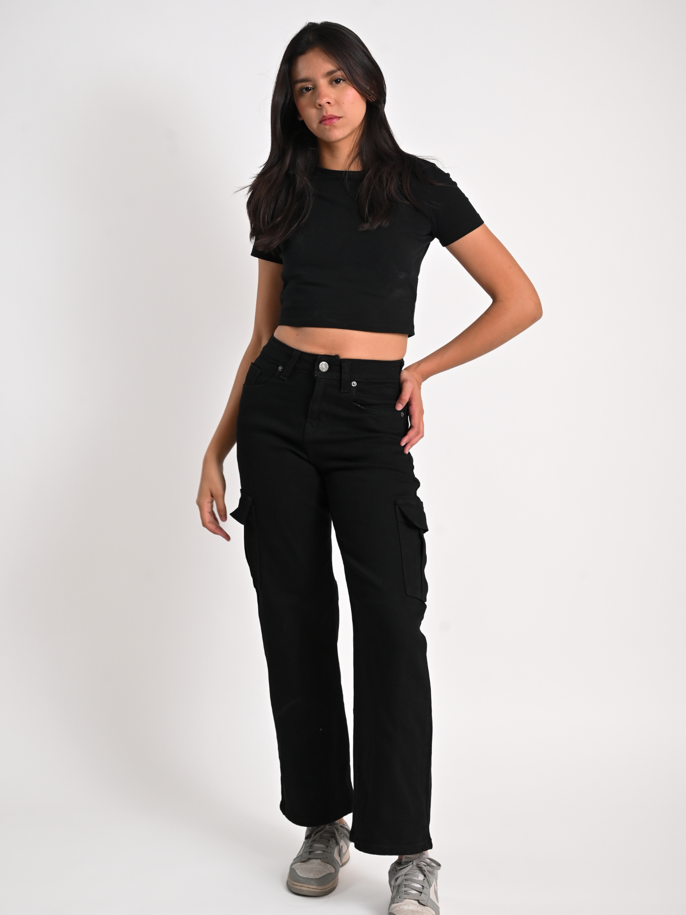Jeans cargo, con bolsillos al costado. Botón y cremallera de metal