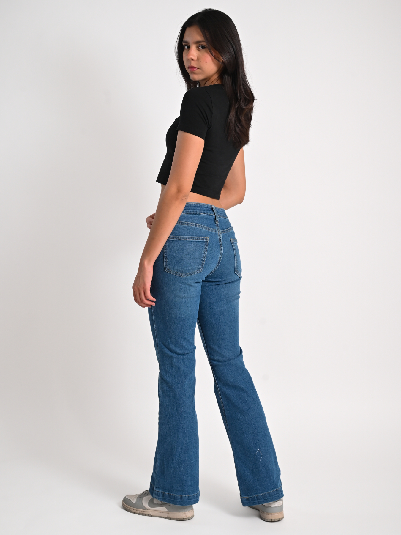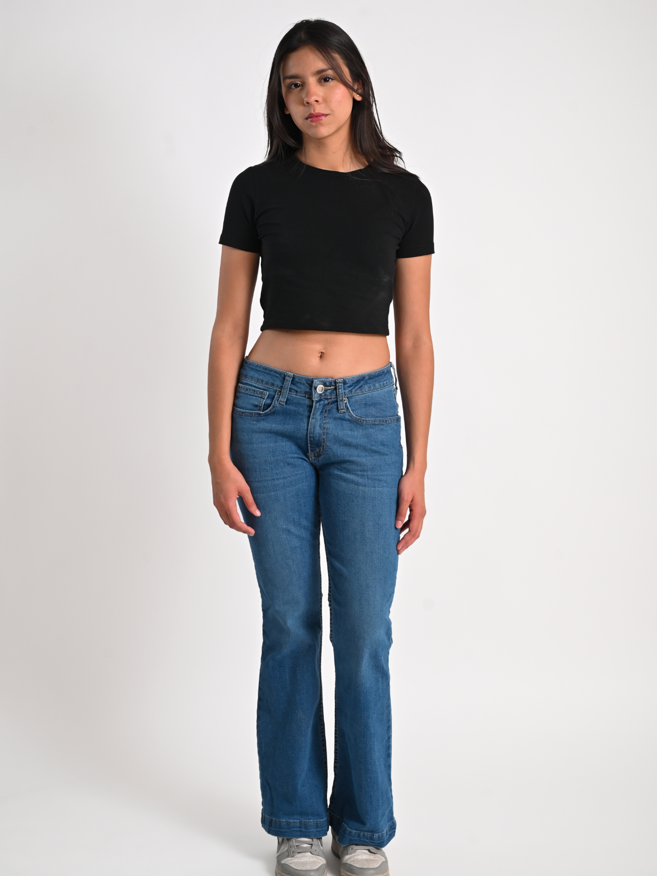 Jeans acampanados de tiro medio. Botón y cremallera de metal.